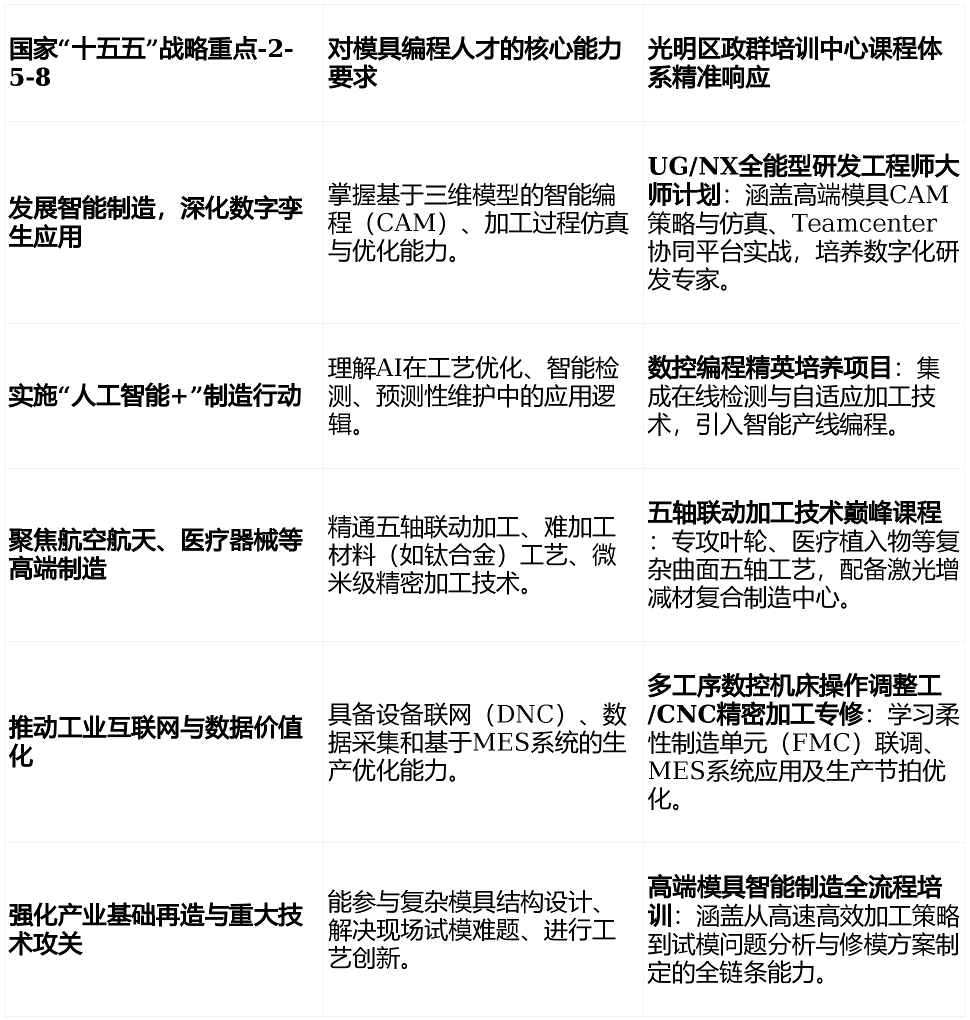 下表清晰了国度计谋若何间接映照为小我必需控制的具体技术,以及区政群培训核心课程的精准对接。