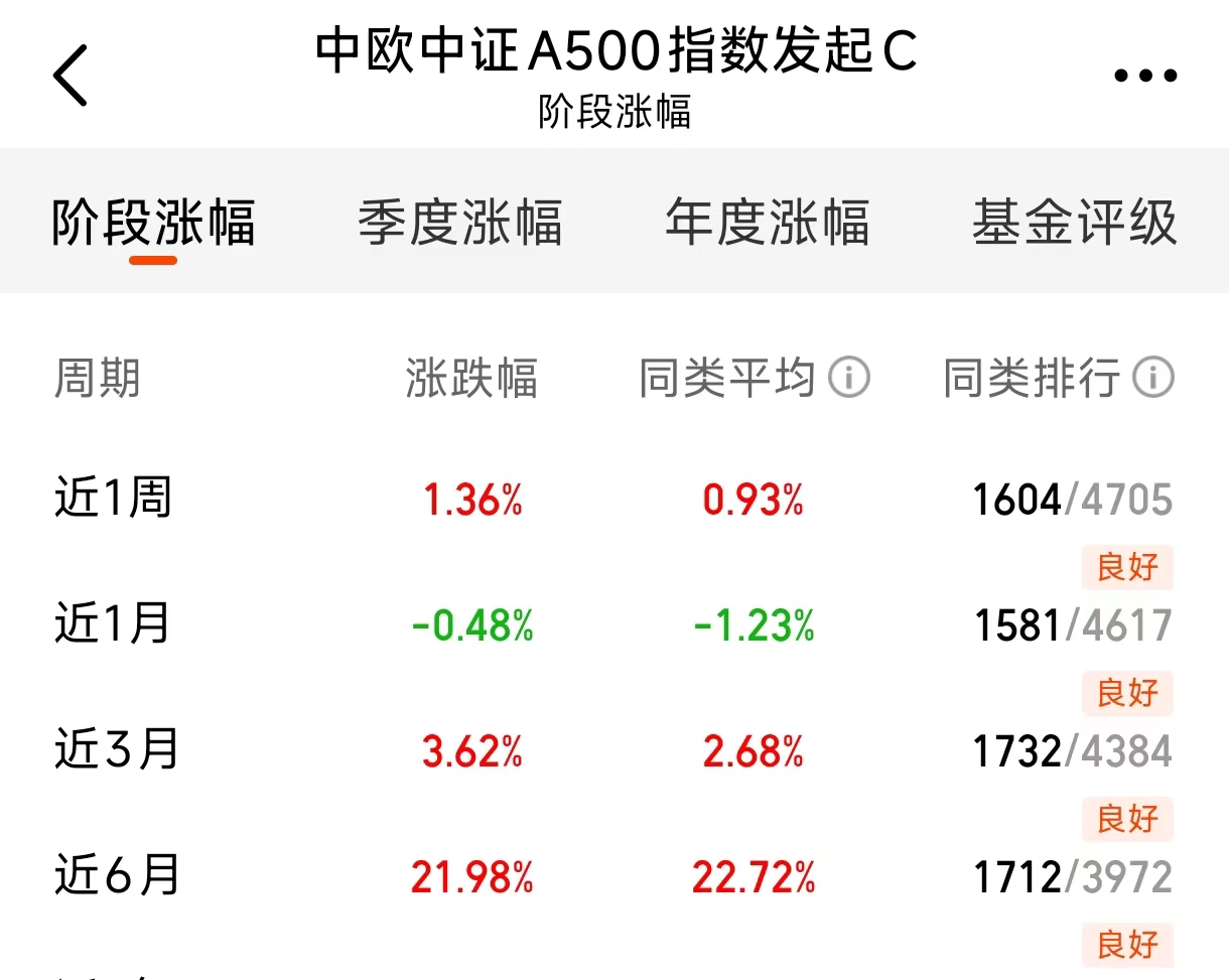 简单间接,今天买了$中欧中证A500指数倡议C$ (022433)。来由就是它比同类强。不比不晓得,一比吓一跳,而中欧这个表示好,抗跌能力更强。这差距明大白白,申明中欧的加强策略不是白叫的。现正在买中证A500,新经济行业占比高,合适成长标的目的。找个这里面最能打的基金,省心。看准了就下手,别磨蹭。