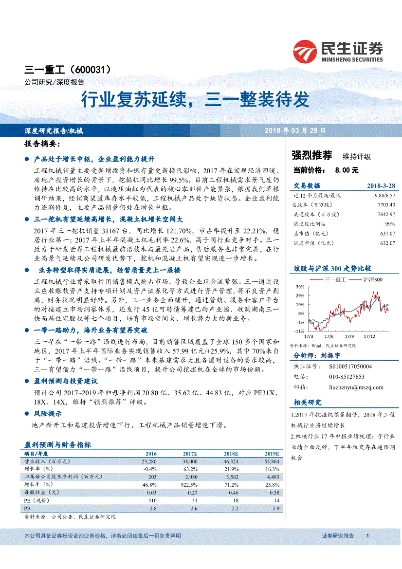 证券研究演讲1 演讲摘要:产物处于增加中枢,企业盈利能力提拔工程机械销量次要受新增投资和保有量更新换代影响,2017年正在宏不雅经济回暖、房地产投资增加的布景下,挖掘机同比增加99。5%。目前工程机械需求景气宇仍维持正在比力高的程度,以液压油缸为代表的焦点零部件产能严重,按照我们草根调研成果,经销商渠道库存程度较低,工程机械产物处于缺货形态。三一挖机无望延续高增加,混凝土机增加空间大2017年三一挖机销量31167台,同比增加121。70%,市占率提拔至22。21%,稳居行业第一;2017年上半年混凝土机毛利率22。6%,高于同业业合作敌手。三一努力于研发世界工程机械最前沿手艺取最先辈产物,售后办事也很是完美,外行业高景气延续及公司研发劣势下,挖机和混凝土机无望实现进一步增加。营业转型取得本色进展,运营质量更上一层楼工程机械行业曾采纳信用发卖模式抢占市场,导致企业现金流严重。三一通过设立应收账款资产支撑专项打算及资产证券化等体例进行资产办理,将不良资产剥离,财政情况较着好转。别的,三一营业全面铺开,通过营销、办事和客户平台的对接成立市场洞察系统,还刊行45亿可转债筹建巴西财产园、收购湖南三一快而居室第股权等七个项目,培育市场空间大、增加潜力大的新营业。一带一路帮力,海外营业无望再冲破三一早正在“一带一路”沿线进行结构,目前发卖区域笼盖了全球150多个国度和地域,2017年上半年国际营业实现发卖收入57。99亿元/+25。9%,此中70%来自于“一带一路”沿线。“一带一路”将来基建需求大且对设备的要求较高,三一无望借力“一带一路”沿线项目,提拔公司挖掘机正在全球的市场份额。盈利预测取投资估计公司2017~2019年归母净利润20。80亿、35。62亿、44。83亿,对应PE31X、18X、14X,维持“强烈保举”评级。别的,从工程机械的需求看次要仍是受新增投资总规模的影响,可是保有量的改换需求也是影响工程机械销量的主要要素。从工程机械新机销量形成来看,正在2016年基建投资和房地产新开工趋向较为不变环境下,挖掘机销量高增加次要是下逛基建、地产开工带来的更新替代需求。2017年房地产投资增加、PPP项目落地、基建投资增加等多厚利好前提下,中国挖掘机械市场需求正在2017年实现了大幅增加。图1:2010-2017挖掘机销量及增速材料来历:中国工程机械工业年鉴,平易近生证券研究院图2:工程机械新机销量形成国内工程机械需求新增需求新增固定资产投资对工程机械需求更新需求保有量裁减出清爽增投资总规模(或固定资产投资完成额)单元投资的工程机械需求保有量材料来历:平易近生证券研究院拾掇工程机械产物销量好转的同时,企业运营目标也逐步转好,三一、中联、徐工、山推等工程机械出产企业16年起头收入增速呈现分歧程度的降幅收窄以至正增加,整个工程机械行业正在必然程度上起头回暖-50 -20 10 40 70 100 0 20000 40000 60000 80000 100000 120000 140000 160000 180000 200000 7挖掘机销量(台,左轴)同比(%,左轴) 证券研究演讲4 三一沉工(600031) 图3:2010-2017工程企业出产企业营收同比增速材料来历:公司通知布告,平易近生证券研究院2017年挖掘机销量140303台,同比增加99。5%;国内市场销量130559台,同比增加107。5%;出口销量9672台,同比增加32。0%,国内市场大幅增加。起沉机2016年销量9455台,同比增加2。60%;推土机销量4061台,同比增加10。29%;拆载机销量75445台,同比增加2。50%。图4:工程机械其他产物销量(台) 图5:工程机械其他产物增速(%) 材料来历:Wind,中国工程机械工业年鉴,平易近生证券研究院 材料来历:Wind,中国工程机械工业年鉴,平易近生证券研究院(二)行业盈利能力逐步修复按照分会统计数据和计较方式,估算截至2017年岁尾,挖掘机械六年保有量约78。9万台,八年保有量约118。3万台,十年保有量约141。1万台。此中,大挖、中挖和小挖的六年保有量别离约为:11。9万台、23。3万台和43。7万台;八年保有量别离约为:18。5万台、41。3万台和58。6万台;十年保有量别离约为22。1万台、52。4万台和66。6万台。-60 -30 0 30 60 90 120 150201027Q3徐工机械三一沉工中联沉科山推股份0 50000 100000 150000 200000 20126推土机拆载机汽车起沉机-60 -45 -30 -15 0 15 20126推土机拆载机汽车起沉机 证券研究演讲5 三一沉工(600031) 图6:保有量计较公式材料来历:CCMA挖掘机协会分会,平易近生证券研究院(附:从起始年起头累积量,再加上起始年上一年份的部门产物) 按照小抓紧机小时数数据,2017年12月份开机小时数为138。1小时,同比增加1。62%。分机型来看,MINI型、6吨级、10吨级、20吨级、30吨级、40吨级开机小时数别离为107。4/123。4/132。5/129。1/181。3/181。8小时,同比别离增加-1。5%/-2。2%/-0。4%/+0。6%/+6。7%/6。2%,中大挖开机小时数增幅较着要高于小挖,申明下逛大型基建项目开工以及矿山采矿需求连结兴旺。行业从2013年起头已收缩发卖政策,清理应收账款,节制过期,逐渐提拔信用发卖首付比例,杜绝零首付以至低首付现象,激励银行按揭。此中,三一沉工、徐工机械、柳工的资产减值丧失占比曾经起头下降,而中联沉科于2017年集中处置汗青承担,资产欠债表已显著修复,估计2018年起头资产减值丧失占比也将起头下降。从目前发布的业绩快报来看,三一2017年度实现归属于上市公司股东的净利润为20。3到21。1亿元,同比增898%到937%;徐工2017年度估计净利润10-10。5亿